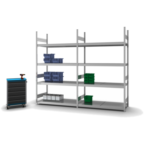 Die wichtigsten Maße des hofe Weitspannregals auf einen Blick:4 Ebene(n) mit Stahlboden. Fachhöhen je nach Einsatzzweck und Ihrem Bedarf im Raster von 25 mm verstellbar. Nutzung beidseitig - flexible Aufstellung frei im Raum möglich. Durch gesickte Tiefen-Verbindungsblechen und Stahl-Fußplatten ist das Regal besonders standfest. Obere Profilabdeckkappen sorgen für einen sauberen Abschluss. Konstruktion aus Stahl, Ständer mit korrosionsschützender Zinkbeschichtung, Ebenen mit korrosionsschützender Zinkbeschichtung,