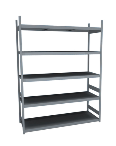 Die wichtigsten Maße des hofe Weitspannregals auf einen Blick:5 Ebene(n) mit Stahlboden. Fachhöhen je nach Einsatzzweck und Ihrem Bedarf im Raster von 25 mm verstellbar. Nutzung beidseitig - flexible Aufstellung frei im Raum möglich. Durch gesickte Tiefen-Verbindungsblechen und Stahl-Fußplatten ist das Regal besonders standfest. Obere Profilabdeckkappen sorgen für einen sauberen Abschluss. Konstruktion aus Stahl, Ständer mit korrosionsschützender Zinkbeschichtung, Ebenen mit korrosionsschützender Zinkbeschichtung,