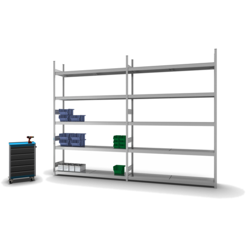 Die wichtigsten Maße des hofe Weitspannregals auf einen Blick:5 Ebene(n) mit Stahlboden. Fachhöhen je nach Einsatzzweck und Ihrem Bedarf im Raster von 25 mm verstellbar. Nutzung beidseitig - flexible Aufstellung frei im Raum möglich. Durch gesickte Tiefen-Verbindungsblechen und Stahl-Fußplatten ist das Regal besonders standfest. Obere Profilabdeckkappen sorgen für einen sauberen Abschluss. Konstruktion aus Stahl, Ständer mit korrosionsschützender Zinkbeschichtung, Ebenen mit korrosionsschützender Zinkbeschichtung,