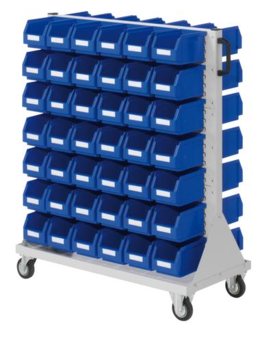 Nutzung beidseitig - flexible Aufstellung frei im Raum möglich. Rückwand mit Schlitzplatten für waagerechtes ein- und aushängen der Kästen. 2 horizontale Handgriffe an den Seiten für ein einfaches verschieben zwischen verschiedenen Arbeitsplätzen. Konstruktion aus Stahl. Ständer mit strapazierfähiger Kunststoffbeschichtung in RAL7035 Lichtgrau. mit 2 Lenk- und 2 Bockrollen mit spurloser Bereifung für ein bodenschonendes Verfahren. Lenkrollen mit Feststeller.