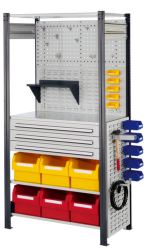 Die wichtigsten Maße des Kappes Kombiregals RasterPlan® auf einen Blick:4 Ebene(n) mit Stahlboden. Fachhöhen je nach Einsatzzweck und Ihrem Bedarf im Raster von 25 mm verstellbar. Zusätzlicher Stauraum für Werkzeuge und Kleinteile in 3 Schublade(n).