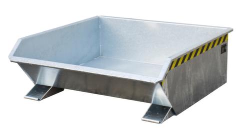 Die wichtigsten Maße des Bauer Kippbehälters MGU 460 auf einen BlickDer Kippvorgang wird bequem vom Fahrersitz aus per Zugseilentriegelung ausgelöst. Die Abrollkufen gewährleisten durch Ausnutzung des günstigen Lastenschwerpunktes eine sanftes Abkippen. mit Kippsicherung gegen unbeabsichtigtes Abrutschen. Mit einer Sicherungskette an den Einfahrtaschen kann der Kippbehälter zusätzlich am Stapler gegen Abrutschen gesichert werden . Robuste Konstruktion aus Stahl mit korrosionsschützender Zinkbeschichtung. Zum einfachen Transportieren und Entleeren nehmen Sie den Kippbehälter einfach mit dem Stapler über die Einfahrtaschen auf und bringen ihn auf die gewünschte Position und erforderliche Höhe.