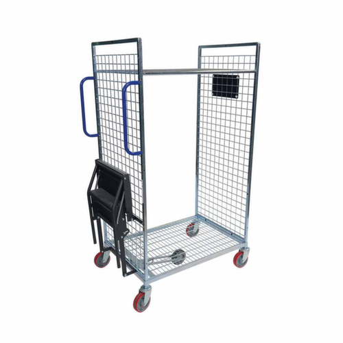 Aufbauten: 2 Wände (Drahtgitter). Konstruktion aus Stahlrohr galvanisch blau verzinkt. Leicht zu manövrieren und verfahren durch 4 Lenkrollen. Rad Ø 125 mm. Mit hoch belastbarer, geräuscharmer Polyurethan-Bereifung auf Polyamid-Felge.