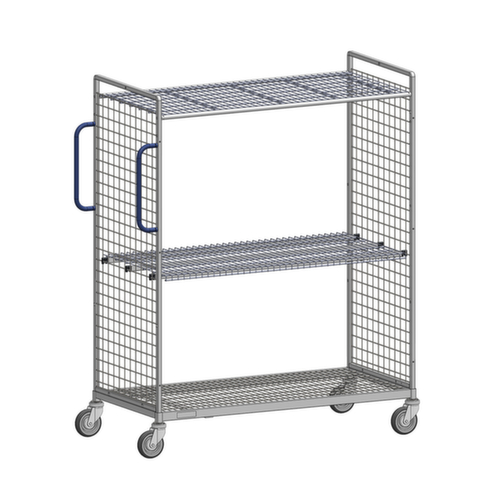 Aufbauten: 2 Wände (Drahtgitter). Konstruktion aus Stahlrohr galvanisch blau verzinkt. Leicht zu manövrieren und verfahren durch 4 Lenkrollen. Rad Ø 125 mm. Mit hoch belastbarer, geräuscharmer Polyurethan-Bereifung auf Polyamid-Felge.