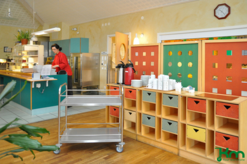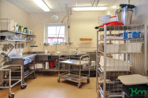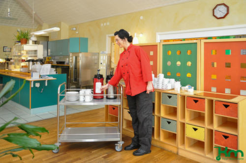 Etage(n) aus Edelstahl mit umlaufendem Edelstahl-Schutzrand, dank dem Gläser, Flaschen oder sonstige Ladungen auf dem Wagen vor dem Herunterfallen geschützt werden. Edelstahlkonstruktion. Leicht zu manövrieren und verfahren durch 4 Lenkrollen, 2 Räder mit Feststellern. Rad Ø 100 mm. Räder mit bodenschonender TPE-Bereifung. Gehäuse aus Stahl. Naben mit Schwenklager mit zweifachem Kugel-Drehkranz. Dadurch wird eine 360°-Drehung ermöglicht. Radanordnung rechteckig.Unser Kundenservice-Team steht Ihnen gerne zur Verfügung.