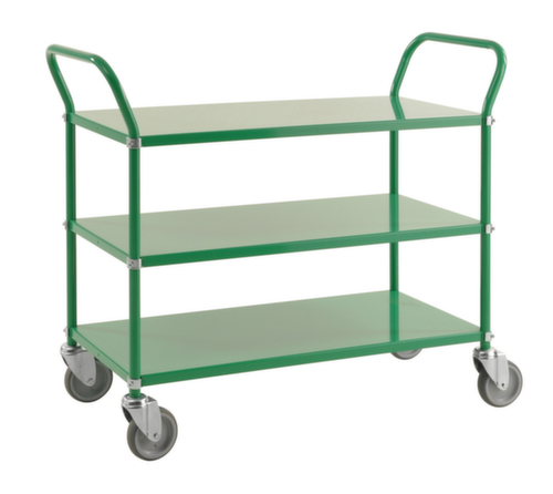 Etage(n) aus Metall mit schlag- und kratzfester Pulverbeschichtung in grün. Etage(n) mit Schutzkante. Schiebebügel hoch. Gestell mit schlag- und kratzfester Pulverbeschichtung in grün. Konstruktion aus Stahl. Leicht zu manövrieren und verfahren durch 4 Lenkrollen. Rad Ø 125 mm. Räder mit bodenschonender TPE-Bereifung auf bruchsicherer und robuster Polypropylen-Felge. Naben mit Präzisionskugellager. Gehäuse aus Stahl. Montagehinweis: Böden mit Aufkantung nach unten oder oben montierbar.