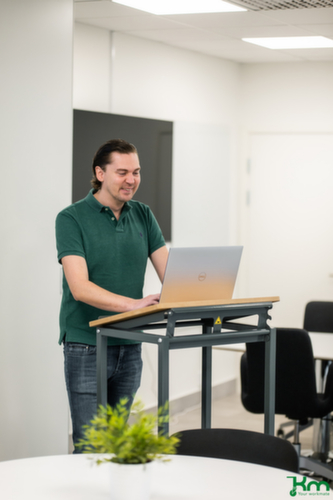 Etage(n) Buche. Etage(n) mit Schutzkante. Gestell in dunkelgrau. Konstruktion aus Stahl. Leicht zu manövrieren und verfahren durch 4 Lenkrollen, Feststeller an zwei Lenkrollen gewähren bei Bedarf stets einen sicheren Stand. Rad Ø 100 mm. Radanordnung parallel.