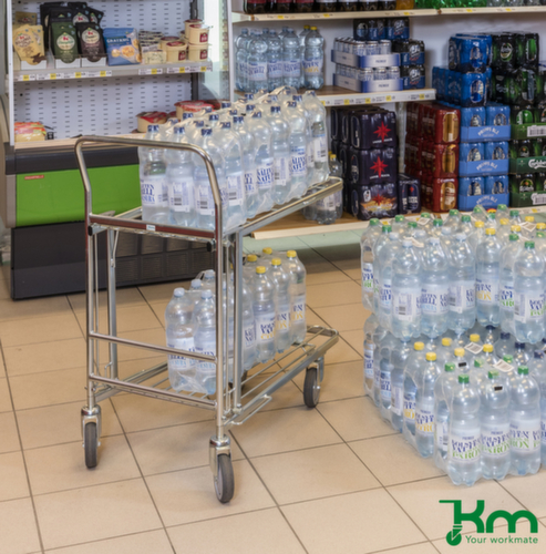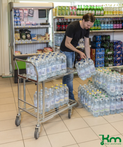 Plattform aus Stahlstreben mit korrosionsschützender Zinkbeschichtung. Aufbau Schiebebügel. Konstruktion aus Stahl elektrolytisch verzinkt. Wandkonstruktion offen, mit Stahlstreben. Platzsparend ineinander stapelbar. Leicht zu manövrieren und verfahren durch 4 Lenkrollen, Feststeller an zwei Lenkrollen gewähren bei Bedarf stets einen sicheren Stand. Rad Ø 125 mm. Mit bodenschonender TPE-Bereifung auf bruchsicherer und robuster Polypropylen-Felge. Naben mit Präzisionskugellager.