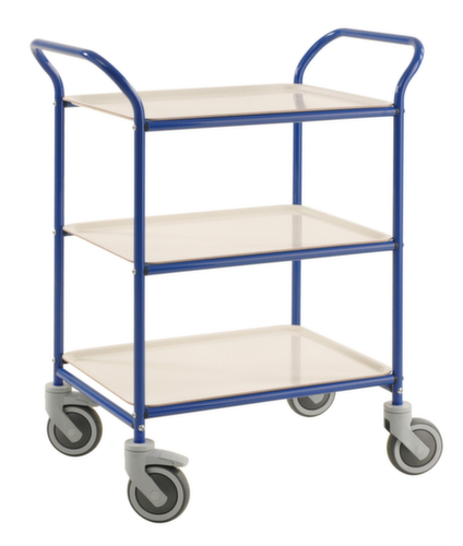 Etage(n) herausnehmbar. Etage(n) gerade. Gestell mit schlag- und kratzfester Pulverbeschichtung in blau. Stahlkonstruktion. Leicht zu manövrieren und verfahren durch 4 Lenkrollen, 2 Rollen mit Feststellern. Rad Ø 125 mm. Räder mit bodenschonender TPE-Bereifung. Naben mit Präzisionskugellager. Radanordnung rechteckig. Die Anlieferung erfolgt zerlegt - einfache Selbstmontage.Unser Kundenservice-Team steht Ihnen gerne zur Verfügung.