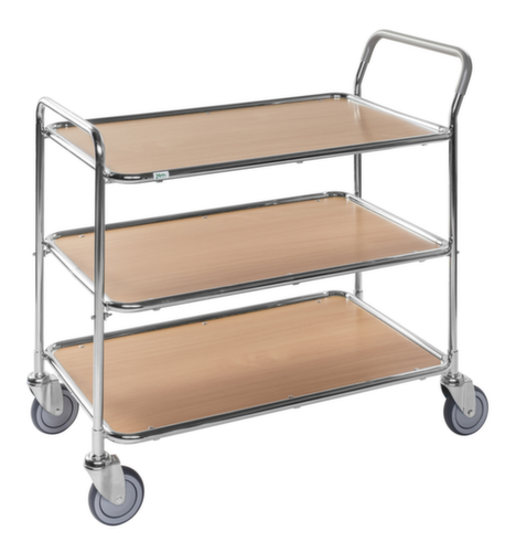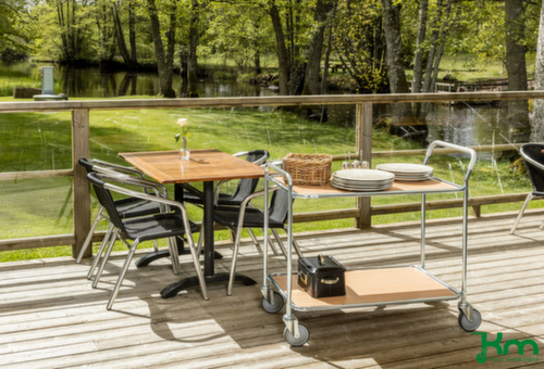 Etage(n) mit abriebfester und feuchtigkeitsbeständiger Melaminbeschichtung in Buche. Etage(n) mit Abrollrand. Schiebebügel hoch, mit Kunststoffummantelung. Gestell elektrolytisch verzinkt. Konstruktion aus Stahl. Leicht zu manövrieren und verfahren durch 4 Lenkrollen. Rad Ø 125 mm. Räder mit bodenschonender TPE-Bereifung auf bruchsicherer und robuster Polypropylen-Felge. Naben mit Präzisionskugellager. Gehäuse aus Stahl. Radanordnung parallel.