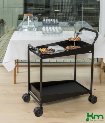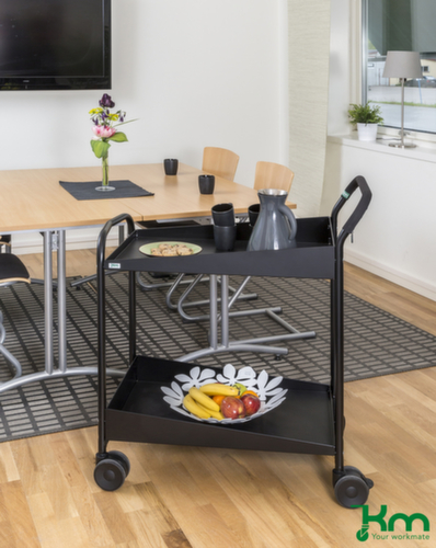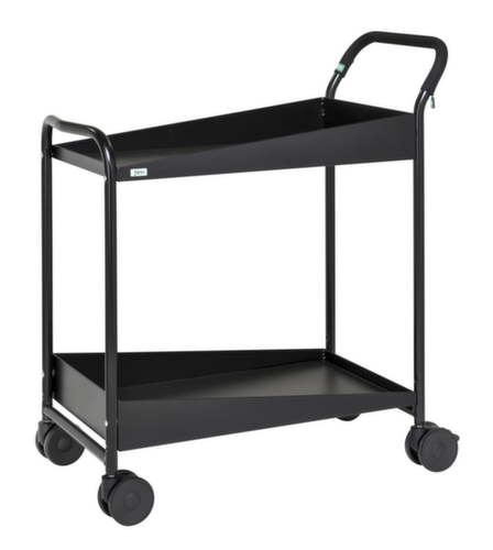 Etage(n) aus Stahl mit Gummibelag in schwarz. Etage(n) mit Rand an den Längsseiten. Randhöhe 31 mm. Mit 2 Böden. Schiebebügel hoch. Gestell mit schlag- und kratzfester Pulverbeschichtung in schwarz. Konstruktion aus Stahl. Leicht zu manövrieren und verfahren durch 4 Lenkrollen, 2 Rollen mit Feststellern. Rad Ø 100 mm. Mit bodenschonender TPE-Bereifung. Naben mit für den Dauerbetrieb geeignetem Kugellager. Radanordnung rechteckig.