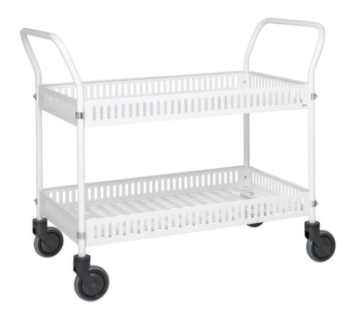 Etage(n) aus Blech mit schlag- und kratzfester Pulverbeschichtung in weiß. Etage(n) mit Schutzrand. Randhöhe 90 mm. Gestell mit schlag- und kratzfester Pulverbeschichtung in weiß. Konstruktion aus Stahl. Leicht zu manövrieren und verfahren durch 4 Lenkrollen, Feststeller an zwei Lenkrollen gewähren bei Bedarf stets einen sicheren Stand. Rad Ø 125 mm. Räder mit bodenschonender TPE-Bereifung auf bruchsicherer und robuster Polypropylen-Felge. Naben mit Präzisionskugellager. Radanordnung rechteckig.