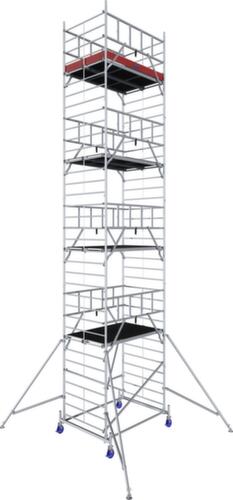 Rutschhemmend profilierte Sprossen ermöglichen einen sicheren Innenaufstieg. Bühne mit wetterfestem und rutschhemmenden Belag. Sichere Anwendung durch GuardMatic-System. Durch die Befestigung des Geländerrahmens GuardMatic vor dem Einhängen der nächsthöheren Bühne ist der sichere Aufbau gewährleistet. Außerdem ist dadurch beim Durchsteigen ein komplettes Geländer und somit eine Absturzsicherung vorhanden. 4 Ausleger sorgen für zusätzliche Standsicherheit. Mit 4 gebremsten, höhenverstellbaren Fahrrollen zum Ausgleich von Bodenunebenheiten. Gerüst aus Aluminium. Belastbar bis 200 kg/m².
