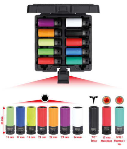 "longDescription": "<ul><li class=\"liste\">robuste Ausführung</li><li class=\"liste\">speziell für die Radmontage bzw. -Demontage</li><li class=\"liste\">6-kant</li><li class=\"liste\">Innenvierkant nach DIN 3121 / ISO 1174</li><li class=\"liste\">lange Ausführung</li><li class=\"liste\">für Maschinenbetätigung</li><li class=\"liste\">kunststoffummantelt zum beschädigungsfreien Arbeiten an Alu-Felgen</li><li class=\"liste\">mit Kunststoff-Einsatz zum Schutz der Oberflächen an den Radschrauben</li><li class=\"liste\">Kunststoffhülse auswechselbar</li><li class=\"liste\">farblich codiert nach Schlüsselweite</li><li class=\"liste\">inklusive Sondergröße für Tesla</li><li class=\"liste\">inklusive Sonderprofil für Mercedes, Hyundai und Kia</li><li class=\"liste\">phosphatiert</li><li class=\"liste\">Chrom-Molybdän</li><li class=\"liste\">in stabilem Kunststoffkoffer</li></ul><br><br><strong>Enthaltene Teile:</strong><br>- 1 x 1/2\" Alu-Felgen Kraft-Stecknuss robust, lang, 15mm<br>- 1 x 1/2\" Alu-Felgen Kraft-Stecknuss robust, lang, 17mm<br>- 1 x 1/2\" Alu-Felgen Kraft-Stecknuss robust, lang, 19mm<br>- 1 x 1/2\" Alu-Felgen Kraft-Stecknuss robust, lang, 21mm<br>- 1 x 1/2\" Alu-Felgen Kraft-Stecknuss robust, lang, 22mm<br>- 1 x 1/2\" Alu-Felgen Kraft-Stecknuss robust, lang, 23mm<br>- 1 x 1/2\" Alu-Felgen Kraft-Stecknuss robust, lang, 24mm<br>- 1 x Spezial-Alu-Felgen Kraft-Stecknuss für Tesla, lang, 7/8\"<br>- 1 x Spezial-Alu-Felgen Sonderprofil-Kraft-Stecknuss für Mercedes, lang, 17 mm<br>- 1 x 1/2\" Spezial-Alu-Felgen Sonderprofil-Kraft-Stecknuss für Hyundai / Kia, lang, MS21<br>",