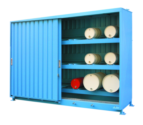 Für maximal 24 x 200-Liter-Fass, Einlagerung liegend. Zur Lagerung im Freien. Geeignet für wassergefährdende und brennbare Stoffe. Bauweise des Containers behördlich zugelassen.
