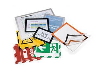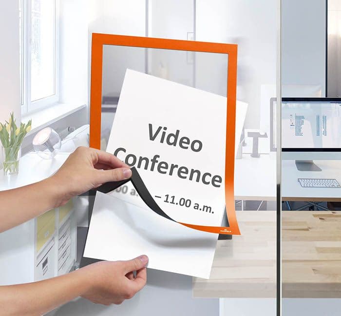 Die werkzeuglose Anbringung auf verschiedenen Oberflächen sorgt für einen schnellen Einsatz im gesamten Unternehmen, sei es in der Verwaltung, in der Produktion oder der Logistik, auf Glas, Metallflächen, Tapeten oder Textilwänden. Der DURAFRAME Info-Rahmen bietet stets die richtige Lösung.