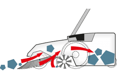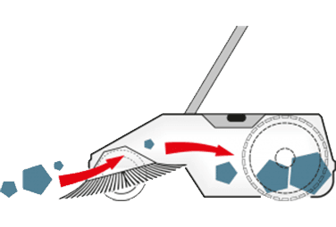 Zwei gegenläufig rotierende Bürsten erfassen das Kehrgut vorne an der Maschine und schieben es direkt in den Schmutzbehälter. Das Kehrgut wird somit nicht überfahren und weggeschoben.