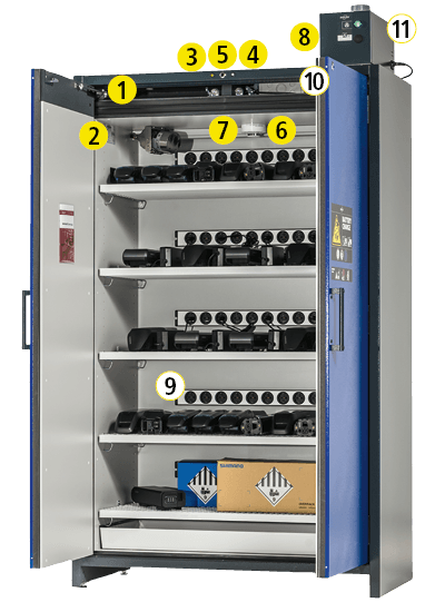 Die Modelle BATTERY CHARGE und BATTERY STORE PRO verfügen neben dem feuerbeständigen, passiven Brandschutz von außen und von innen zusätzlich über ein hochwertiges 3-stufiges Warn- und Brandunterdrückungssystem im Schrankinnenraum. Folgende Komponenten sind bei beiden Modellen enthalten: