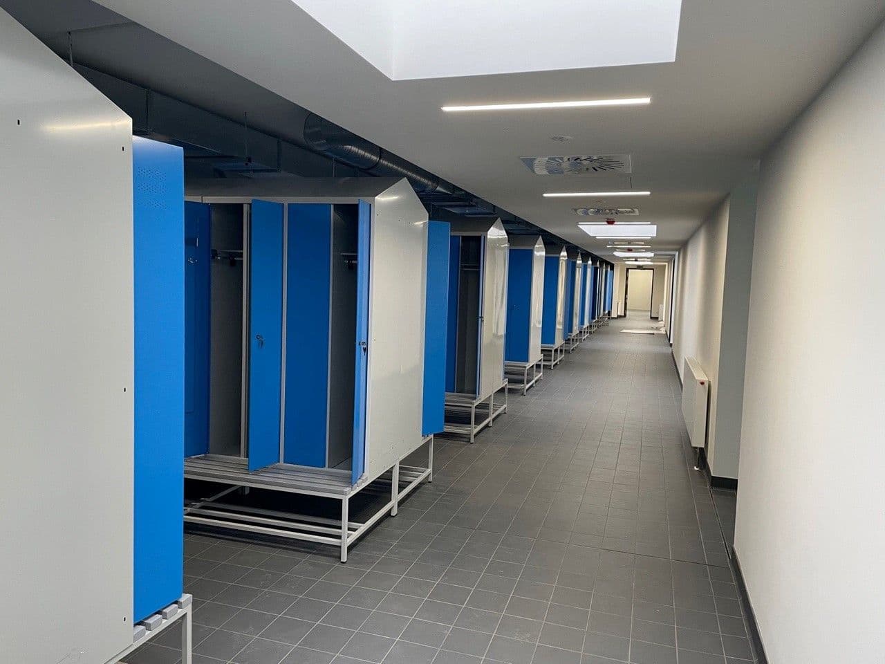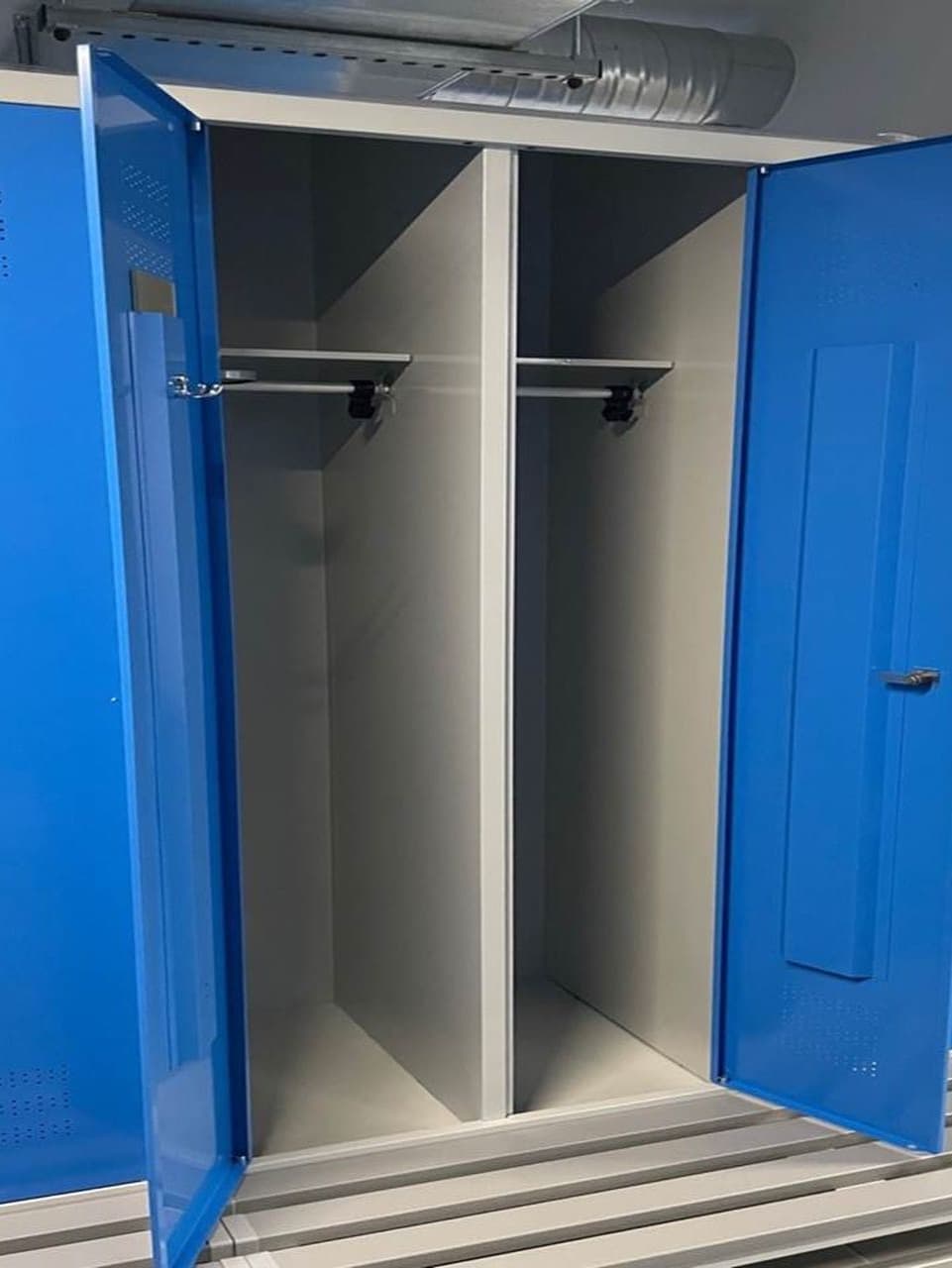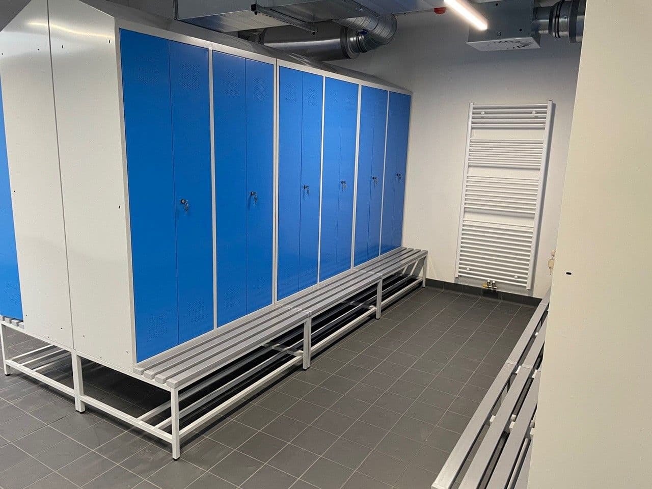 91 Garderobenspinde mit 4 Abteilen für 182 MA in Sonderausführung: mit Schrägdach, Sitzbank, Schließsystem und Inneneinrichtung