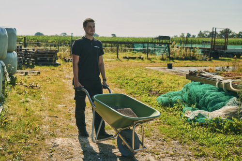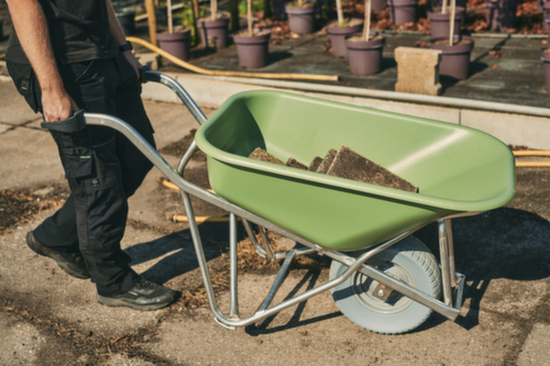 Mulde aus Hochdruck-Polyethylen in grün. Konstruktion aus Aluminium. Sicherheitsgriffe mit Knöchelschutz, sodass das Handgelenk gerade und nicht gebogen ist und die Last von 4 statt nur 2 Fingern getragen wird. Rad mit pannensicherer Polyurethan-Bereifung auf rostfreier Stahl-Felge. Naben mit doppelt abgedichtetem und robusten Kugellager.