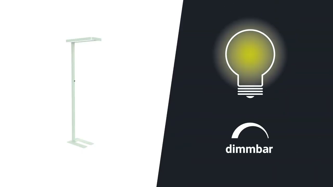 Leuchtenkopf mit ca. 50 % Abstrahlung nach oben und unten und Diffusor für einen geringen Schattenwurf. Höhe 1960 mm, Leuchtenkopf Länge x Breite 610 x 280 mm, Standfuß Länge x Breite 450 x 300 mm, mit Ausschnitt für Tischbein. Aus Aluminium in weiß. Kabel 2,5 m lang.