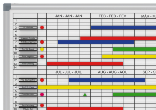 oben Kalender Januar bis Dezember mit kompletter Wocheneinteilung, unten Tageseinteilung für Personen/Projekte