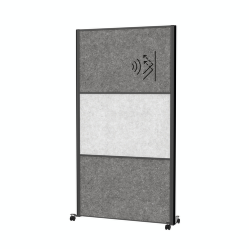Zum Aufstellen auf dem Boden. Wand aus Polyestervlies (als optimales Dämmmaterial) in dunkelgrau/hellgrau (aufgeteilt in 2 Wände in dunkelgrau und 1 Wand in hellgrau). Oberfläche pinnbar. Rahmen aus Aluminium in anthrazit. Unterbau mit Rollen mit Bremse. Jederzeit erweiterbar: Mehrere Stellwände können lückenlos über Klettverbindungen aneinander gereiht werden.