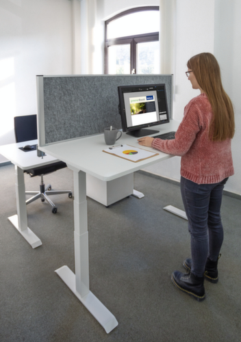 Zur Befestigung am Tisch. Wand aus Polyestervlies (als optimales Dämmmaterial) in dunkelgrau. Oberfläche pinnbar. Rahmen aus Aluminium.