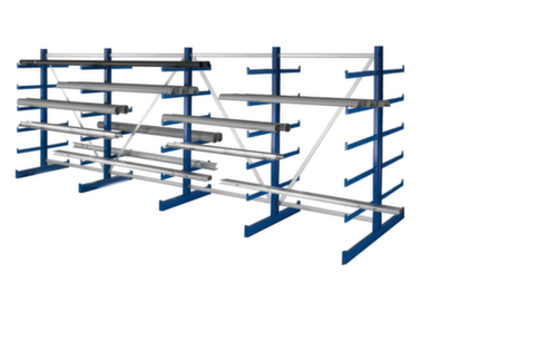 Die wichtigsten Maße des META Kragarmregals Atlas ST auf einen Blick:Nutzung beidseitig - flexible Aufstellung frei im Raum möglich. 6 Lagerebenen. 5 Ebene(n) mit Kragarm, mit Abrollsicherung. Traglast je Arm 200 kg. Gleich lange Arme, gerade ausgerichtet. Nutztiefe 500 mm. Konstruktion aus Stahl. Ständer sandgestrahlt mit Pulverbeschichtung in RAL5010 Enzianblau. Kragarme sandgestrahlt mit Pulverbeschichtung in RAL5010 Enzianblau.
