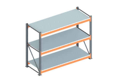 Die wichtigsten Maße des META Weitspannregals Multipal S auf einen Blick:3 Ebene(n) mit Stahlpaneele. Fachhöhen je nach Einsatzzweck und Ihrem Bedarf im Raster von 50 mm verstellbar. Nutzung einseitig - zur Aufstellung an der Wand konzipiert. Konstruktion aus Stahl. Ständer mit korrosionsschützender Zinkbeschichtung. Ebenen mit korrosionsschützender Zinkbeschichtung. Traversen mit schlag- und kratzfester Pulverbeschichtung in RAL2001 Rotorange.