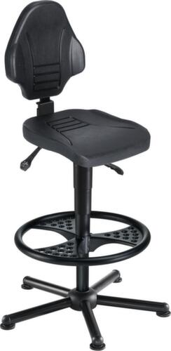 Mit Stuhlmechanik samt Anti-Schock-Sicherung gegen das nach vorne Schnellen der Lehne auch nach dem Lösen der Arretierung. Mit Standardsitz aus PU-Schaum in schwarz. Stuhl mit Sitztiefen-/Sitzneigeverstellung. Sitzhöhenverstellung über Gasfeder durch Hebel.