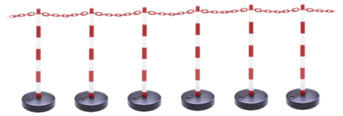 "longDescription": "<h2>Kettenständer-Set</h2><strong>mobiles Komplett-Set zum schnellen Absperren</strong><br><ul><li><strong>Set bestehend aus:</strong> 6 Kettenständern, 10 m Kette, 10 Verbindungsgliedern, 10 Einhängehaken</li><li>Mit integrierter Kettenaufnahme</li><li><strong>Leicht und unempfindlich</strong> - Pfosten aus Kunststoff</li></ul><br><strong>Sie haben die Wahl:</strong><br><ul><li><strong>Für jeden Zweck den richtigen Fuß</strong> - dreieckig aus Kunststoff mit Beton gefüllt, rund aus Kunststoff individuell befüllbar oder quadratisch aus Hartgummi</li></ul><br>Das Kettenständer-Set ist perfekt geeignet zum einfachen und schnellen mobilen Absperren. Mit den im Lieferumfang enthaltenen 6 Kettenständern, 10 m Kette, 10 Verbindungsgliedern und 10 Einhängehaken kann jeder beliebige Bereich abgesperrt werden. Durch die Höhe von 870 mm ist die Absperrung für Autofahrer und Fußgänger immer gut sichtbar. <br><br>Die Pfosten aus Kunststoff haben einem Durchmesser von 40 mm und sind in den Farbkombinationen rot/weiß oder gelb/schwarz erhältlich, wodurch eine zusätzliche Signalwirkung entsteht. Außerdem verfügen die Kettenständer über eine integrierte Kettenaufnahme. Die Ständer sind maximal im Abstand von 2 m zu stellen. Je nach Einsatzzweck können Sie zwischen verschiedenen Fußausführungen wählen.<br>",