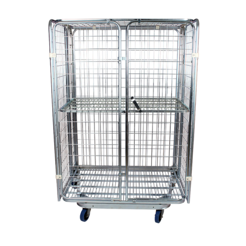 "metaDescription": "Nestbarer Sicherheitsrollbehälter nestainer® mit Doppelflügeltür, Traglast 500 kg, Länge x Breite 800 x 1200 mm - Tragl. 500kg, HxLxB 1820x800x1200mm, Nutz H 1540mm, 3 Gitterwände, Tür, 1 Boden, Dach, 1 Boden, Stahl, verzinkt, Drahtgitterplatte, Elastik-Bereifung",