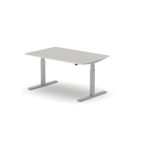 Platte aus Spanplatte mit pflegeleichter Melaminharzbeschichtung in Dekor MB White Grey. Plattenform rechteckig. T-Fußgestell in RAL9006 Weißaluminium. Höhenverstellung durch Elektromotor mit Handschalter und Display. Funktionen: Abspeichern und automatisches Abrufen von programmierten Tischhöhen dank Memoryfunktion. Mit Eurostecker.