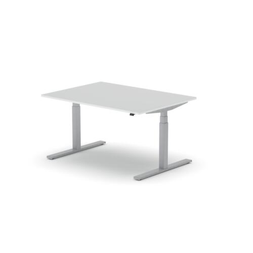 Platte aus Spanplatte mit pflegeleichter Melaminharzbeschichtung in Dekor BI White. Plattenform rechteckig. T-Fußgestell in RAL9006 Weißaluminium. Höhenverstellung durch Elektromotor mit Handschalter. Mit Eurostecker.