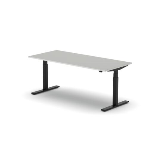 Platte aus Spanplatte mit pflegeleichter Melaminharzbeschichtung in Dekor MB White Grey. Plattenform rechteckig. T-Fußgestell in RAL9005 Tiefschwarz. Höhenverstellung durch Elektromotor mit Handschalter. Mit Eurostecker.