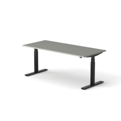 Platte aus Spanplatte mit pflegeleichter Melaminharzbeschichtung in Dekor MP Platinum. Plattenform rechteckig. T-Fußgestell in RAL9005 Tiefschwarz. Höhenverstellung durch Elektromotor mit Handschalter. Mit Eurostecker.