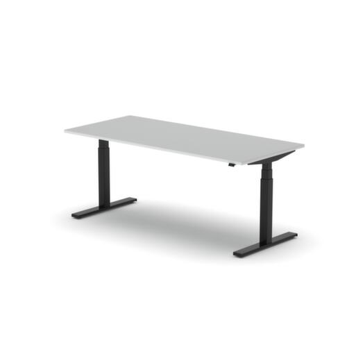 Platte aus Spanplatte mit pflegeleichter Melaminharzbeschichtung in Dekor BI White. Plattenform rechteckig. T-Fußgestell in RAL9005 Tiefschwarz. Höhenverstellung durch Elektromotor mit Handschalter und Display. Funktionen: Abspeichern und automatisches Abrufen von programmierten Tischhöhen dank Memoryfunktion. Mit Eurostecker.