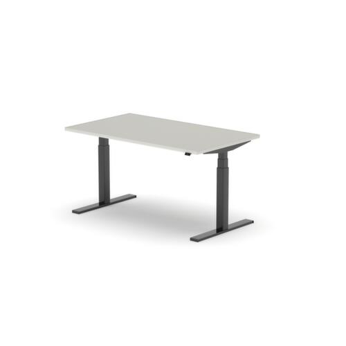 Platte aus Spanplatte mit pflegeleichter Melaminharzbeschichtung in Dekor MB White Grey. Plattenform rechteckig. T-Fußgestell in RAL9005 Tiefschwarz. Höhenverstellung durch Elektromotor mit Handschalter. Mit Eurostecker.
