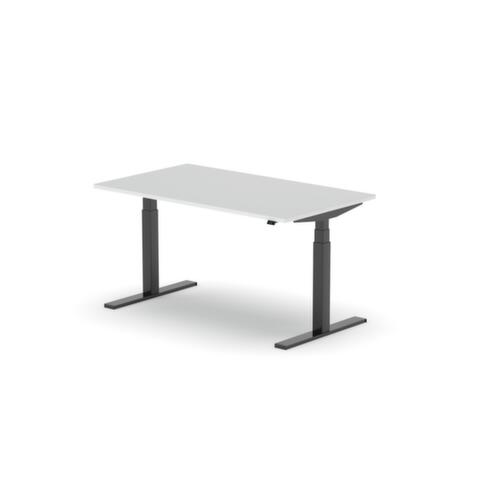 Platte aus Spanplatte mit pflegeleichter Melaminharzbeschichtung in Dekor BI White. Plattenform rechteckig. T-Fußgestell in RAL9005 Tiefschwarz. Höhenverstellung durch Elektromotor mit Handschalter. Mit Eurostecker.
