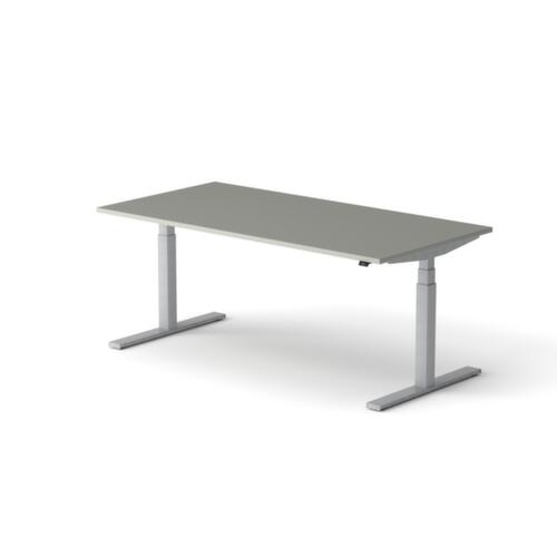 Platte aus Spanplatte mit pflegeleichter Melaminharzbeschichtung in Dekor MP Platinum. Plattenform rechteckig. T-Fußgestell in RAL9006 Weißaluminium. Höhenverstellung durch Elektromotor mit Handschalter und Display. Funktionen: Abspeichern und automatisches Abrufen von programmierten Tischhöhen dank Memoryfunktion. Mit Eurostecker.