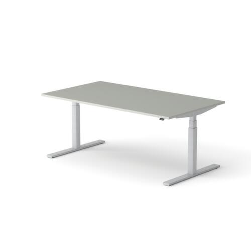 Platte aus Spanplatte mit pflegeleichter Melaminharzbeschichtung in Dekor MP Platinum. Plattenform rechteckig. T-Fußgestell in RAL9006 Weißaluminium. Höhenverstellung durch Elektromotor mit Handschalter. Mit Eurostecker.