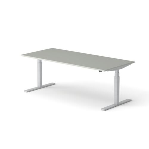 Platte aus Spanplatte mit pflegeleichter Melaminharzbeschichtung in Dekor MP Platinum. Plattenform rechteckig. T-Fußgestell in RAL9006 Weißaluminium. Höhenverstellung durch Elektromotor mit Handschalter. Mit Eurostecker.