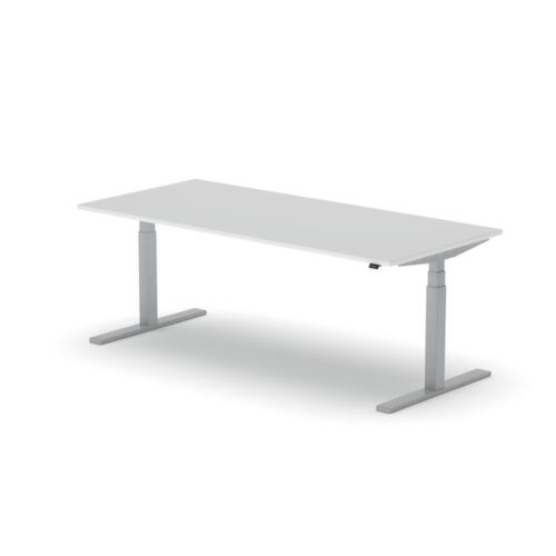 Platte aus Spanplatte mit pflegeleichter Melaminharzbeschichtung in Dekor BI White. Plattenform rechteckig. T-Fußgestell in RAL9006 Weißaluminium. Höhenverstellung durch Elektromotor mit Handschalter und Display. Funktionen: Abspeichern und automatisches Abrufen von programmierten Tischhöhen dank Memoryfunktion. Mit Eurostecker.
