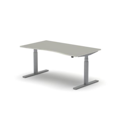 Platte aus Spanplatte mit pflegeleichter Melaminharzbeschichtung in Dekor MB White Grey. Plattenform geschwungen. T-Fußgestell in RAL9006 Weißaluminium. Höhenverstellung durch Elektromotor mit Handschalter und Display. Funktionen: Abspeichern und automatisches Abrufen von programmierten Tischhöhen dank Memoryfunktion. Mit Eurostecker.