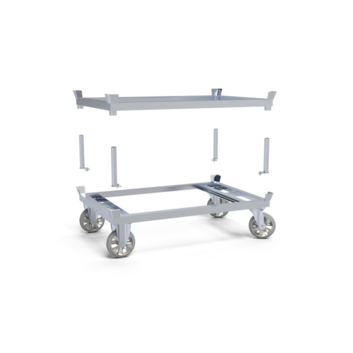 "longDescription": "<h2>Paletten-Fahrgestell</h2><strong>für eine hub- und staplerfreie Produktion</strong><br><ul><li><strong>Praktisch und effizient</strong> - für eine Verwendung im Routenzug geeignet</li><li><strong>Stabil und kratzfest</strong> - Winkelstahlrahmen mit Pulverbeschichtung</li><li><strong>Korrosionsgeschützt</strong> - Oberfläche feuerverzinkt</li><li><strong>Sicherer Transport</strong> durch Winkelstahlrahmen mit 4 Fangecken und Befestigungsösen</li><li><strong>Leicht lenkbar</strong> durch 2 Lenk- und 2 Bockrollen</li></ul><br><strong>Sie haben die Wahl:</strong><br><ul><li><strong>Der Ladung angepasst</strong> - mit verschiedenen Traglasten bis 2000 kg und entsprechender Bereifung verfügbar</li></ul>",