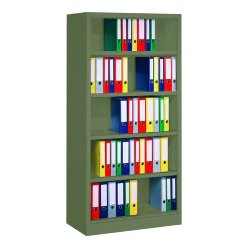 Leicht zugänglicher Stauraum für Akten und Arbeitsunterlagen auf 5 Ordnerhöhen. 4 Ebene(n) mit Stahlboden nach Ihrem Bedarf im Raster von 17 mm verstellbar. Konstruktion aus Stahlblech mit schlag- und kratzfester Pulverbeschichtung. Ebenen in Korpusfarbe.