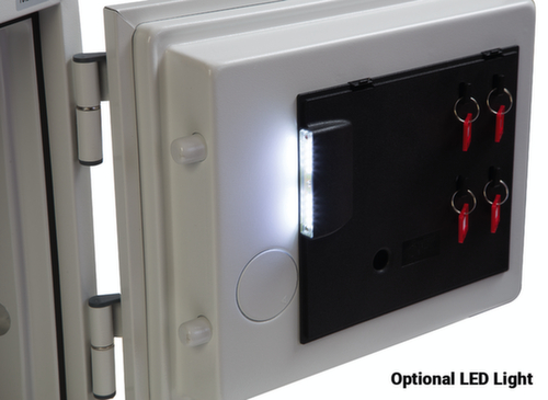 1 Schublade, 4 Schlüsselhaken und 1 höhenverstellbarer Einlegeboden. Mit Flügeltür. Verschließbar mit Elektronikschloss. Konstruktion aus Stahlblech. Korpus mit Lackierung in RAL9003 Signalweiß. Front mit Lackierung in RAL9003 Signalweiß.