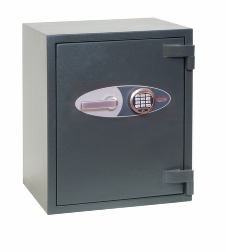 Ausstattung: Boden. Mit Flügeltür. Verschließbar mit elektronischem Hochsicherheitsschloss der VdS-Klasse II mit Doppelsteuerung, Mastercode und Zeitverzögerung. Verriegelung über 3-Wege-Winkelverriegelungsbolzen und sorgt somit für hohe Robustheit. Konstruktion aus Stahl. Korpus mit kratzfester Beschichtung in RAL7024 Graphitgrau. Front mit kratzfester Beschichtung in RAL7024 Graphitgrau. Vorbereitet zur Bodenverankerung.