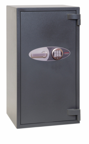 Ausstattung: Böden. Mit Flügeltür. Verschließbar mit elektronischem Hochsicherheitsschloss der VdS-Klasse II mit Doppelsteuerung, Mastercode und Zeitverzögerung. Verriegelung über 3-Wege-Winkelverriegelungsbolzen und sorgt somit für hohe Robustheit. Konstruktion aus Stahl. Korpus mit kratzfester Beschichtung in RAL7024 Graphitgrau. Front mit kratzfester Beschichtung in RAL7024 Graphitgrau. Vorbereitet zur Bodenverankerung.